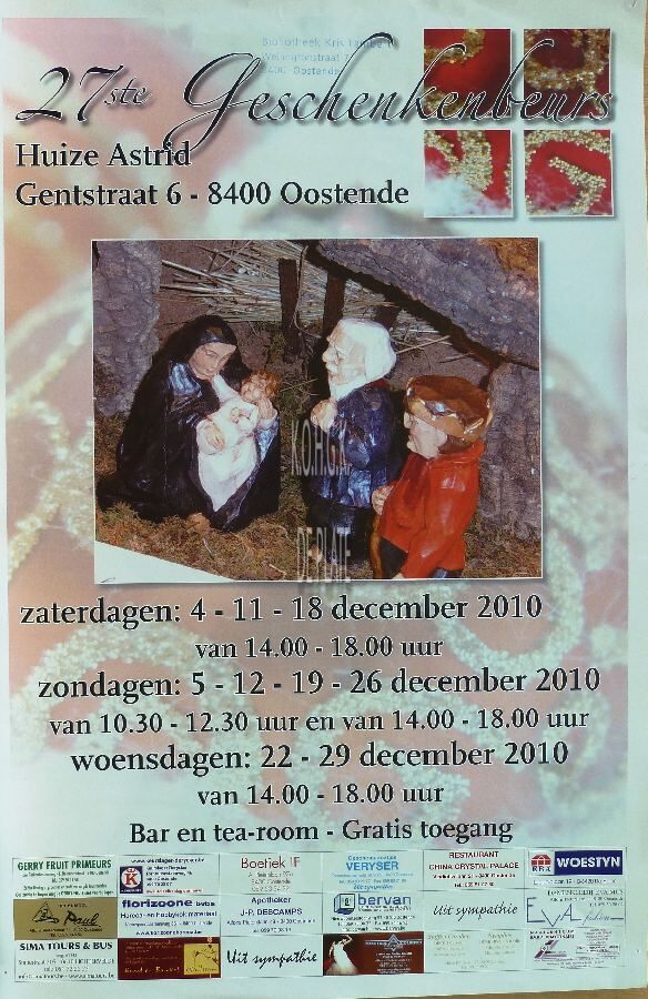 Formaat : 42 x 30 cm. 27ste geschenkenbeurs. Huize Astrid, Gentstraat 6, 8400 Oostende. Zaterdagen ; 4, 11, 18 december 2010 van 14.00 - 18.00 uur. Zondagen : 5, 12, 19, 26 december 2010 van 10.30 - 12.30 uur en van 14.00 - 18.00 uur. Woensdagen : 22, 29 december 2010 van 14.00 - 18.00 uur. Bar en tea-room. Gratis toegang