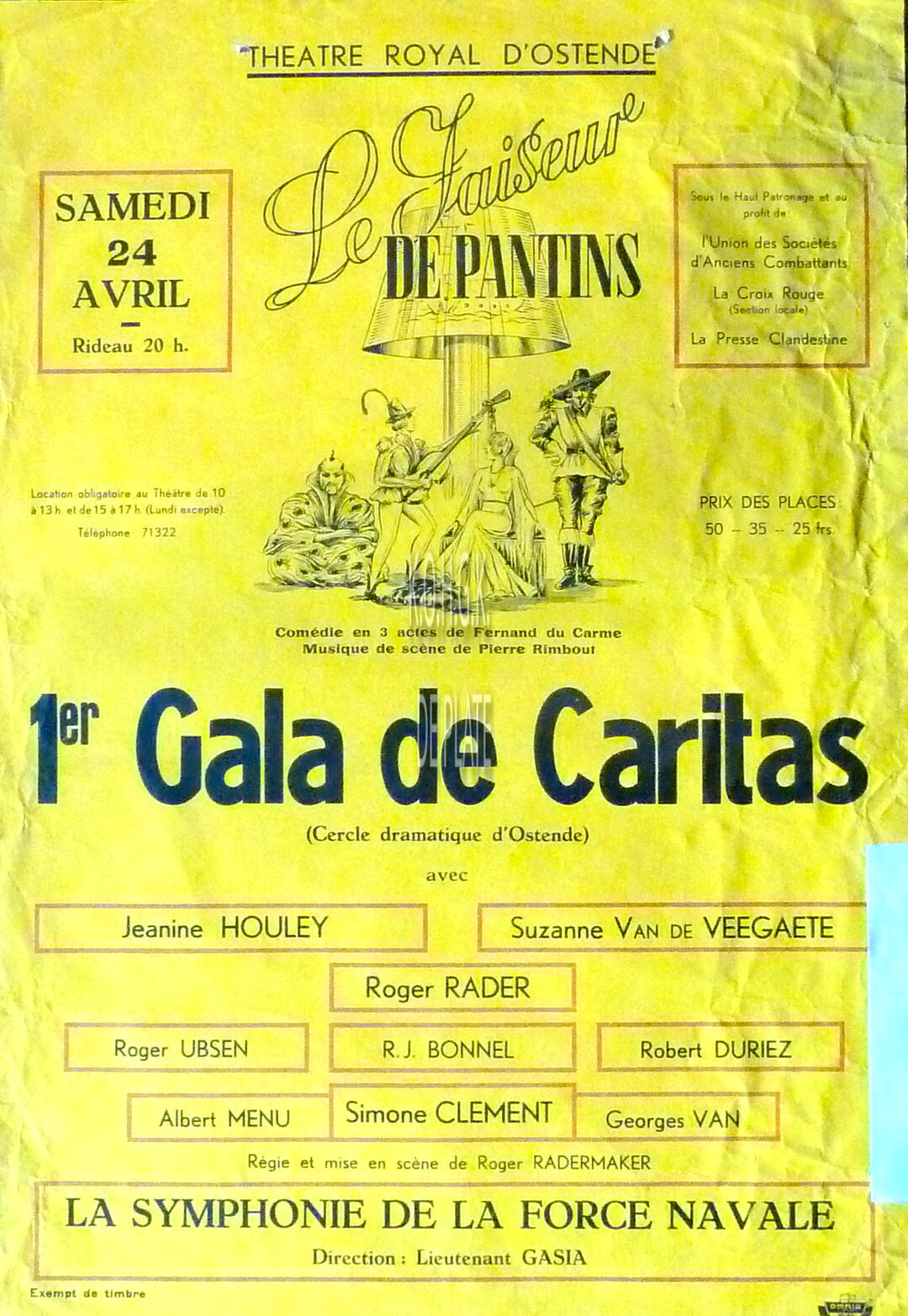 Formaat : 62 x 42 cm. Sous le Haut Patronage et au profit de: l'Union des Sociétés d'Anciens Combattants, La Croix Rouge et la Presse Clandestine. Comédie en 3 actes de Fernard du Carme. Musique de scène de Pierre Rimbout. Avec Jeanine Houley, Suzanne Van de Veegaete, Roger Rader, Roger Ubsen, R.J. Bonnel, Robert Duriez, Albert Menu, Simone Clement & Georges Van. Régie et mise en scène de Roger Radermaker. La Symphonie de la Force Navale, direction: Lieutenant Gasia.