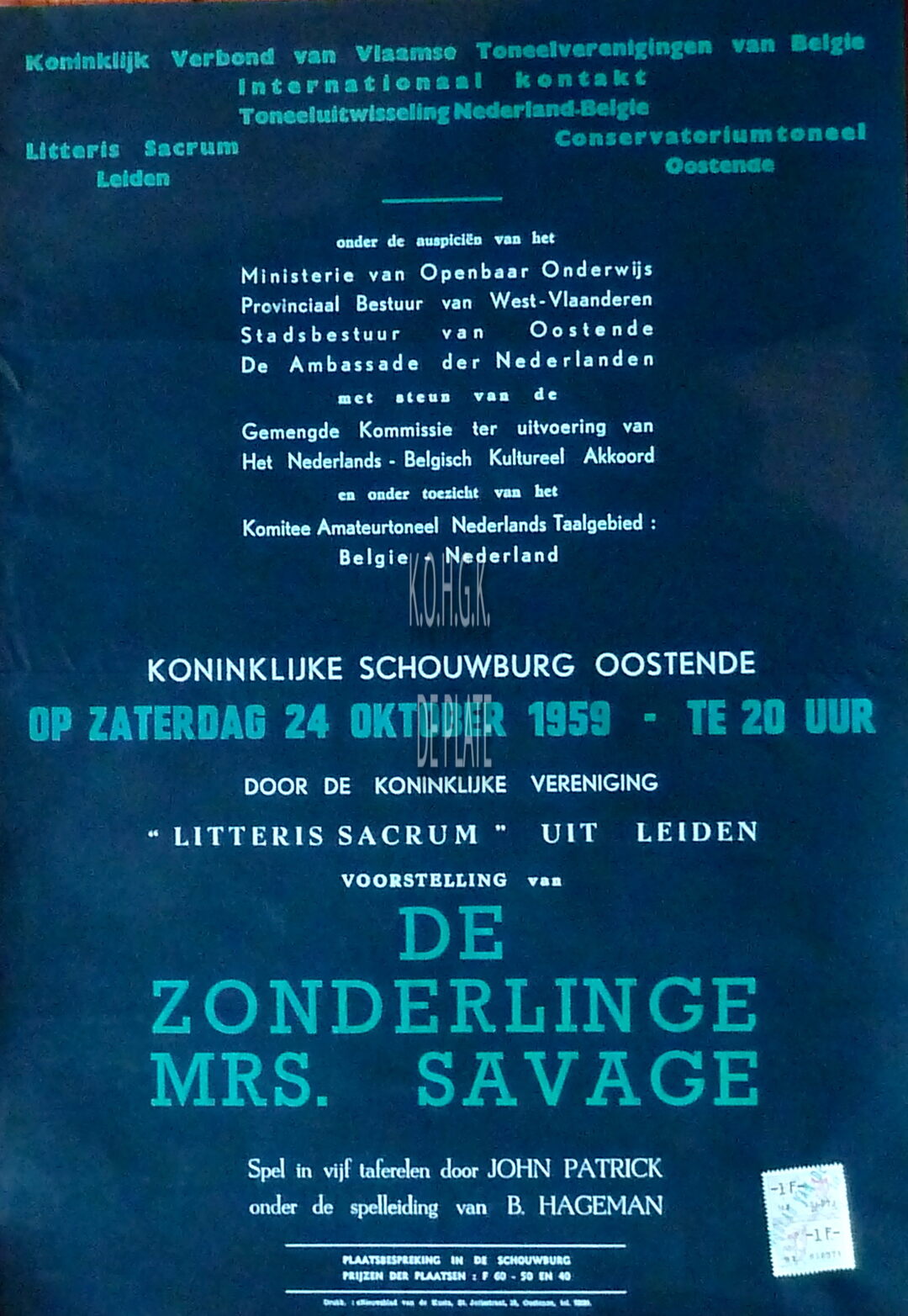 Formaat : 50 x 34 cm. Koninklijk Verbond van Vlaamse Toneelverenigingen van België, Internationale kontakt, Toneeluitwisseling Nederland-België, Litteris Sacrum Leiden, Conservatoriumtoneel Oostende. Onder de auspiciën van het Ministerie van Openbaar Onderwijs, Proventiaal Bestuur van West-Vlaanderen, Stadsbestuur van Oostende, De Ambassade der Nederlanden, met steun van de Gemende Komissie ter uitvoering van Het Nederlands- Belgisch Kultureel Akkoord, en onder toezicht van het Komitee Amateurtoneel Nederlandse Taalgebied: België - Nederland. Spel in 5 taferelen door John Patrick en onder de spelleiding van B. Hageman.