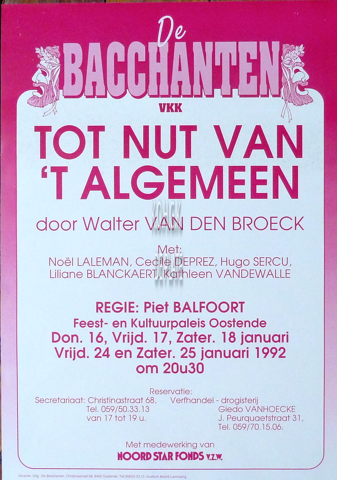 Formaat : 43 x 30 cm. Door Walter Van Den Broeck. Met : Noël Laleman, Cecile Deprez, Hugo Sercu, Liliane Blanckaert, Kathleen Vandewalle. Regie : Piet Balfoort. Met medewerking van Noordstarfonds v.z.w. . Vlaamse Klub Kust.