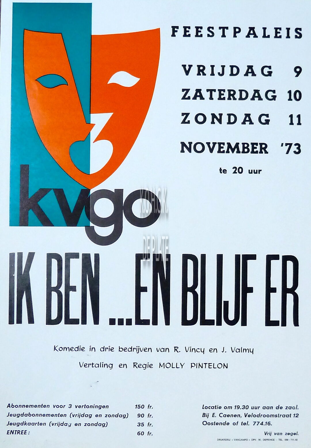 Formaat : 42 x 30 cm. Komedie in drie bedrijven R. Vincy en J. Valmy. Vertaling en regie : Molly Pintelon.
