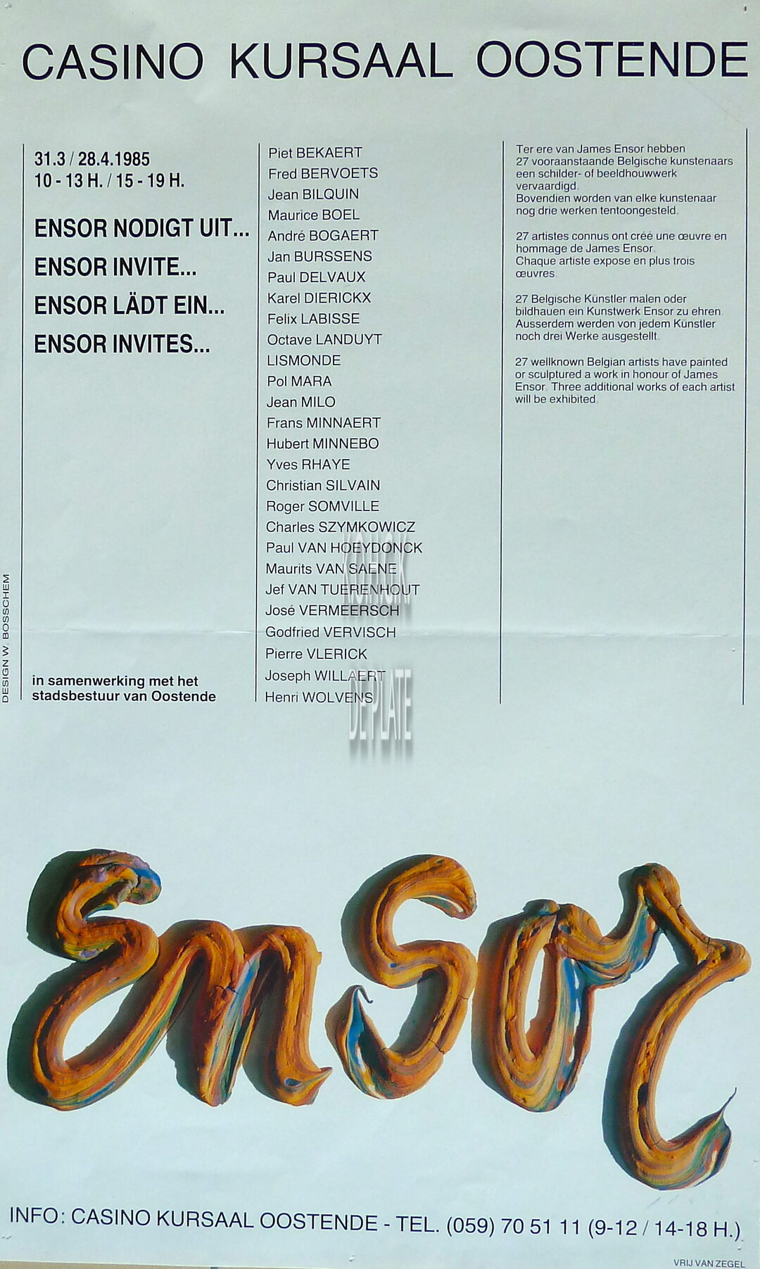 Formaat : 50 x 30 cm. Affiche in vier talen. Piet Bekaert, Fred Bervoets, Jean Bilquin, Maurice Boel, André Bogaert, Jan Burssens, Paul Delvaux, Karel Dierickx, Felix, Labisse, Octave Landuyt, Lismonde, Pol Mara, Jean Milo, Frans Minnaert, Hubert Minnebo, Yves Rhaye, Christian Silvain, Roger Somville, Charles Szymkowicz, Paul Van Hoeydonck, Maurits Van Saene, Jef Van Tuerenhout, José Vermeersch, Godfried Vervisch, Pierre Vlerick, Joseph Willaert, Henri Wolvens. Ter ere van James Ensor hebben 27 vooraanstaande Belgische kunstenaars een schilder- of beeldhouwwerk vervaardigd. Bovendien worden van elke kunstenaar nog drie werken tentoongesteld