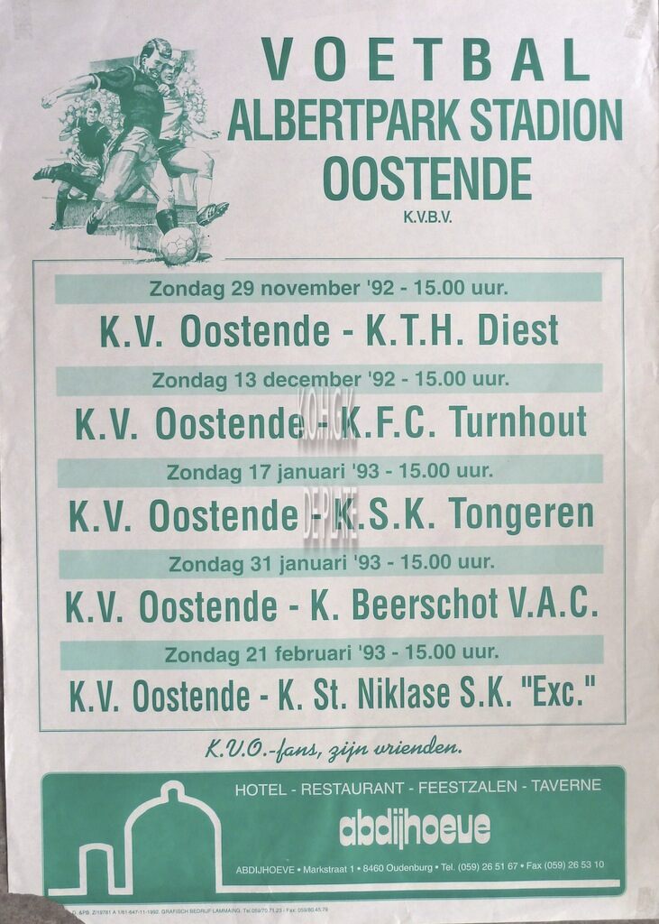 Formaat : 63 x 45 cm. Zondag 29 november ' 92 - 15.00 uur: K.V. Oostende - K.T.H. Diest. Zondag 13 december '92 - 15.00 uur: K.V. Oostende - K.F.C. Turnhout. Zondag 17 januari '93 - 15.00 uur: K.V. Oostende - K.S.K. Tongeren. Zondag 31 januari '93- 15.00 uur: K.V. Oostende - K. Beerschot V.A.C.. Zondag 21 februari '93 - 15.00 uur: K.V. Oostende - K. St. Niklase S.K. "EXC.".