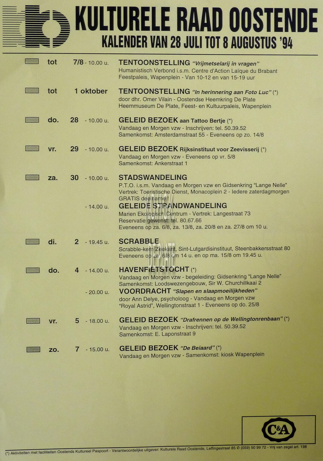 Formaat : 42 x 30 cm. tot 7/8: Tentoonstelling: Vrijmetselarij in vragen. tot 1/10: Tentoonstelling: In herinnering aan Foto Luc. 28/07: Geleid bezoek aan Tattoo Bertje. 29/07: Geleid bezoek: Rijksinstituut voor Zeevisserij. 30/07: Stadswandeling. Geleide strandwandeling. 2/08: Scrabble. 4/08: Havenfietstocht. Voordracht: Slapen en slaapmoeilijkheden, Ann Delye. 5/08: Geleid bezoek: Drafrennen op de Wellingronrenbaan. 7/08: Geleid bezoek: De Beiaard.