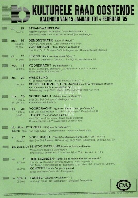 Formaat : 42 x 30 cm. 15/01: Strandwandeling. 16/01: Demonstratie: "Kaas uit België" Voordracht: "Voor God en ons Vaderland". door prof. dr. R. Pinxten. 17/01: Lezing: "Slank worden, slank blijven". door mevr. Mevr. Daenekint. 18/01: Voordracht: "De Baptisten". door J. Verhaeghe. 22/01: Wandeling. Begeleid bezoek tentoonstelling: "Belgische stilleven en bloemenschilderkunst 1750-1914" 23/01: Voordracht: "Griekenland en Kreta" door dhr. Staf De Leger. 26/01: Voordracht: "Hypnose: Kwaad, bedrog of therapie." dhr. J. De Maeyer. Theater: "De moord op Albert I" door dhr. Luc Schoonjans. 26/01, 27/01 en 28/01: Toneel: "Oidipoes in Kolonos". van Hugo Claus. 27/01: Voordracht: " Karel Jockheere en Oostende 1906-1944" door dhr. Dirk Beirens. 28/01-29/01: Tentoonstelling Zandvoordse kunstenaars. 3/02: Drie lezingen: "Humor en de relatie met het onbewuste" door dhr. W. Depecker. Concert Claude Coppens, Pianist. 3/02-4/02: Toneel: "Oidipoes in Kolonos". Van Hugo Claus.