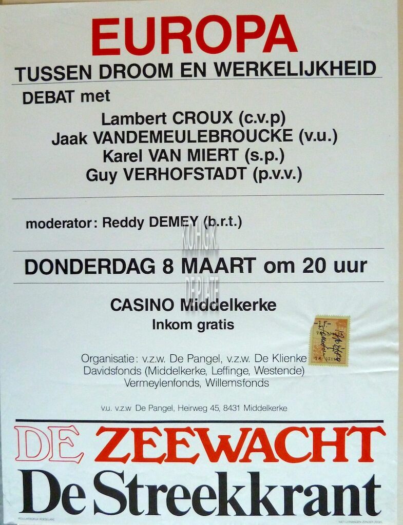 Formaat : 40 x 30 cm. Debat met Lambert Croux (cvp), Jaak Vandemeulebroucke (vu), Karel Van Miert (sp), Guy Verhofstadt (pvv). Moderator : Reddy Demey (brt). Organisatie : vzw De Pangel, vzw De Klienke, Davidsfonds (Middelkerke, Leffinge, Westende), Vermeylenfonds, Willemfonds