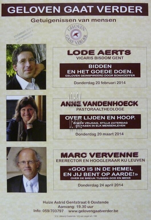Formaat : 44 x 30 cm. - 20 februari 2014 : Lode Aerts : Bidden en het goede doen. 20 maart 2014 : Anne Vandenhoeck : Over lijden en hoop. 24 april 2014 : Marc Vervenne : "God is in de hemel en jij bent op aarde". Huize Astrid. Gentstraat 6, Oostende.