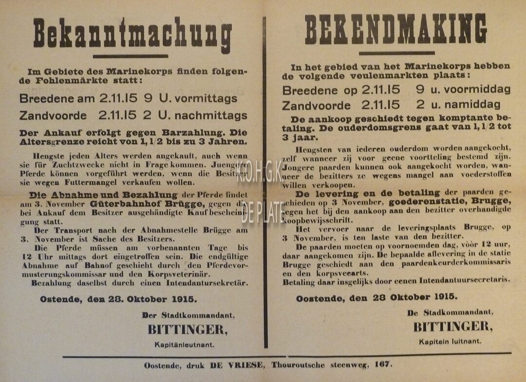 Formaat : 44 x 59 cm. Kennisgeving uitgaande van de Plaatscommandant Bittinger betreffende de veulenmarkten in het gebied van het Marinekorps