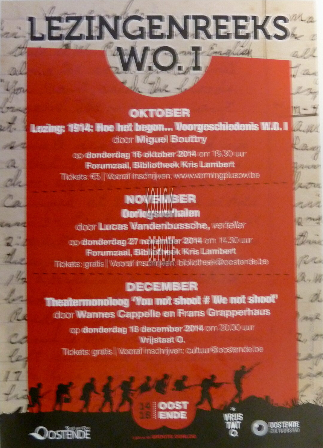 Formaat : 42 x 30 cm. Lezing : 1914 : Hoe het begon... Voorgeschiedenis W.O.I door Miguel Bouttry. 16/10/2014. Forumzaal, Bibliotheek Kris Lambert. Oorlogsverhalen door Lucas Vandenbussche, verteller. 27/11/2014. Forumzaal, Bibliotheek Kris Lambert. Theatermonoloog "You not shoot # We not shoot" door Wannes Cappelle en Frans Grapperhaus. Vrijstaat O. 18/12/2014