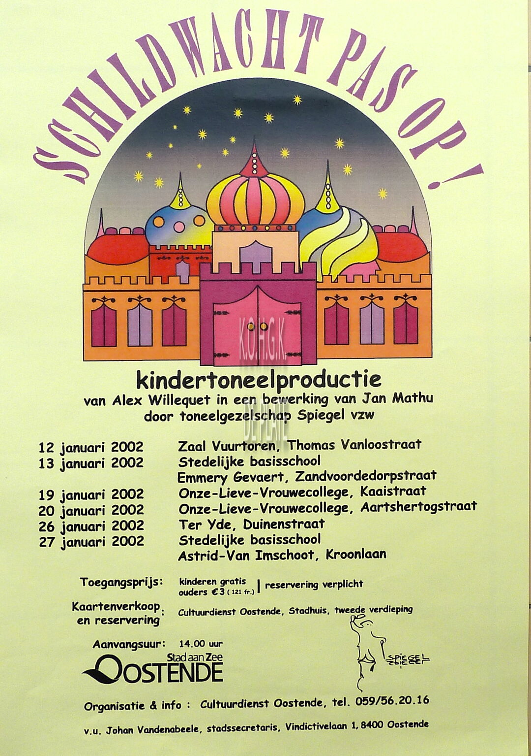 Formaat : 42 x 30 cm. - Kindertoneelproductie van Alex Willequet in een bewerking van Jan Mathu. 2002 : 12/01 : Zaal Vuurtoren ; 13/01 : Stedelijke basisschool Emmery Gevaert ; 19/01 : Onze-Lieve-Vrouwecollege, Kaaistraat ; 20/01 : Onze-Lieve-Vrouwecollege, Aartshertogstraat ; 26/01 : Ter Yde ; 27/01 : Stedelijke basisschool Astrid Van Imschoot