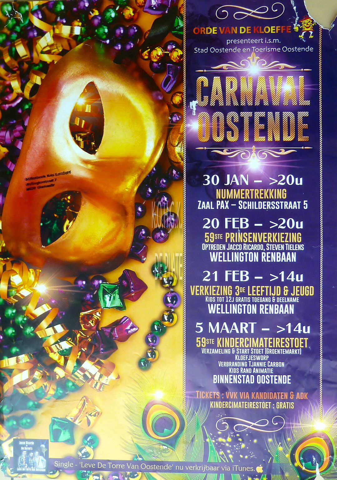 Formaat : 60 x 42 cm. - In samenwerking met Stad Oostende en Toerisme Oostende. Zaal Pax : nummertrekking, 30/01. Wellingtonrenbaan : 59ste prinsenverkiezing, 20/02, Verkiezing 3de leeftijd en jeugd, 21/02. Binnenstad Oostende : 59ste kindercimateirestoet