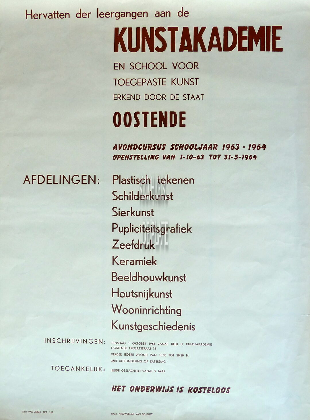 Formaat : 60 x 44 cm. - Avondcursus schooljaar 1963-1964. Openstelling van 1/10/63 tot 31/5/1964. Afdelingen : plastisch tekenen, schilderkunst, sierkunst, publiciteitsgrafiek, zeefdruk, keramiek, beeldhouwkunst, houtsnijkunst, wooninrichting, kunstgeschiedenis. Het onderwijs is kosteloos