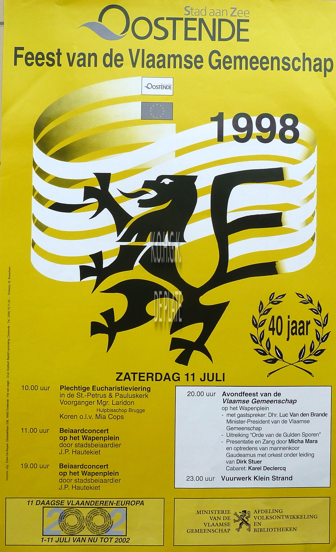 Formaat : 59 x 36 cm. - 11 juli : Plechtige Eucharitieviering in de St. -Petrus en Pauluskerk. Voorganger Mgr. Laridon, hulpbisschop Brugge. Koren o.l.v. Mia Cops. Beiaardconcert op het Wapenplein door stadsbeiaardier J.P. Hautekiet. Avondfeest van de Vlaamse Gemeenschap op het Wapenplein, met gastspreker : dhr. Luc Van den Brande, minister-president van de Vlaamse Gemeenschap. Uitreiking "Orde van de Gulden Sporen". Presentatie en zang door Micha Mara en optredens van mannenkoor Gaudeamus met orkest onder leiding van Dirk Sture. Cabaret : Karel Declercq. Vuurwerk Klein Strand. - Ontwerp : Willy Bosschem