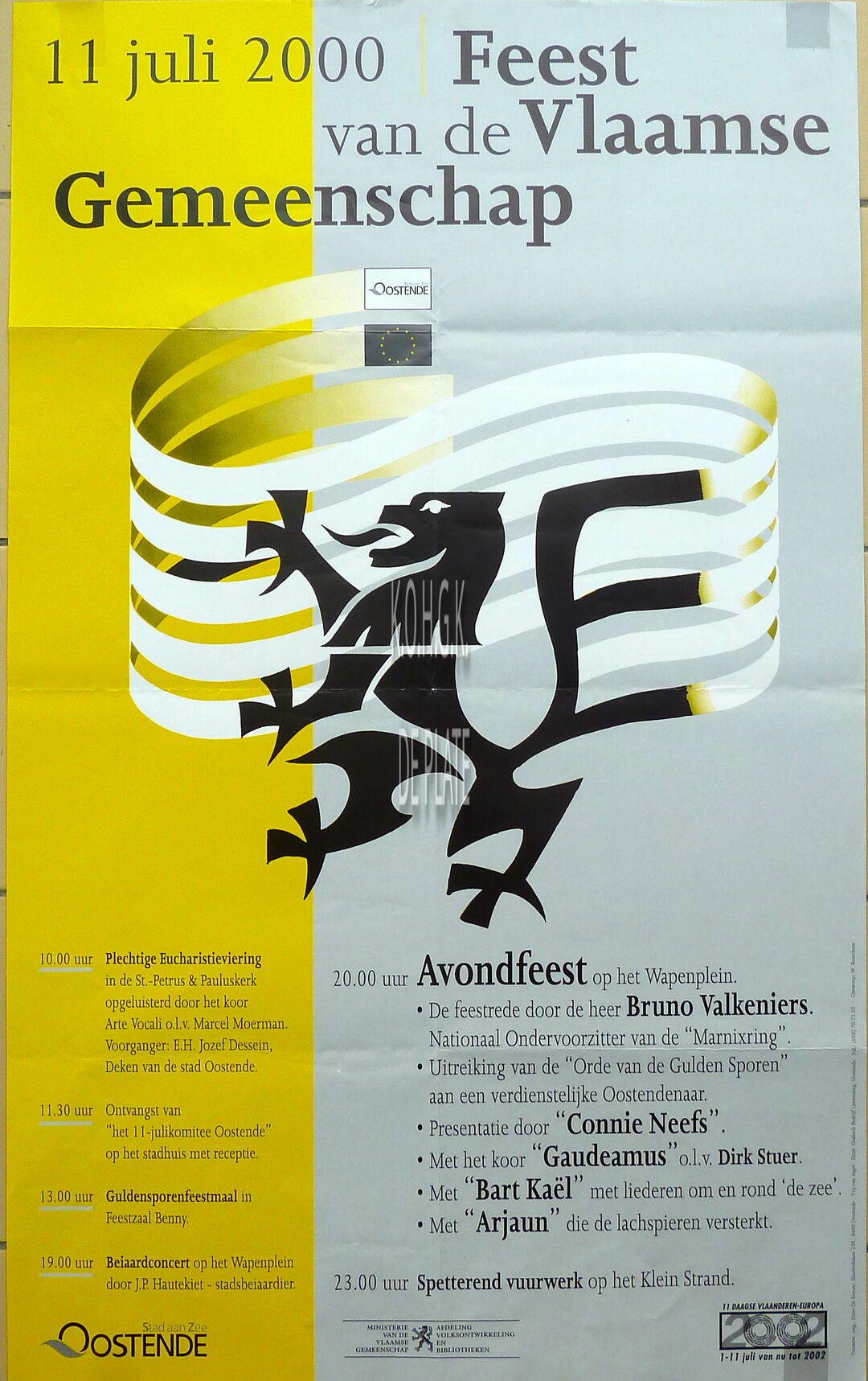 Formaat : 59 x 37 cm. - Plechtige Eucharistieviering in de St. - Petrus en Pauluskerk, opgeluisterd door het koor Arte Vocali o.l.v. Marcel Moerman. Voorganger : E.H. Jozef Dessein, deken van de stad Oostende. Ontvangst van "het 11-julikomitee Oostende" op het stadhuis met receptie. Guldensporenfeestmaal in Feestzaal Benny. Beiaardconcert op het Wapenplein door J.P. Hautekiet, stadbeiaardier. Avondfeest op het Wapenplein. De feestrede door de heer Bruno Valkeniers, nationaal ondervoorzitter van de 3Marnixring". Uitreiking van de "Orde van de Gulden Sporen" aan een verdienstelijk Oostendenaar. Presentatie door "Connie Neefs". Met het koor "Gaudeamus" o.l.v. Dirk Sture. Met "Bart Kaël" met liederen om en rond "de zee". Met "Arjaun" die de lachspiren versterkt. Spetteren vuurwerk op het Klein Strand. - Ontwerp : Willy Bosschem