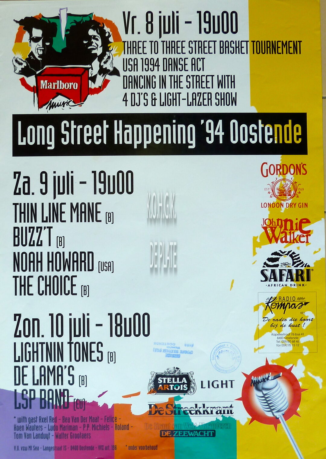 Formaat : 60 x 42 cm. - 8 juli : Three to Three Street Basket Tournement. USA 1994 Danse Act. Dancing in the street with 4 DJ'S & Licht-Lazer Show. 9 juli : Thin Line Mane (B). Buzz't (B). Noah Howard (USA). The Choice (B). 10 juli : Lightnin Tones (B). De Lama's (B). LSP Band (EU)