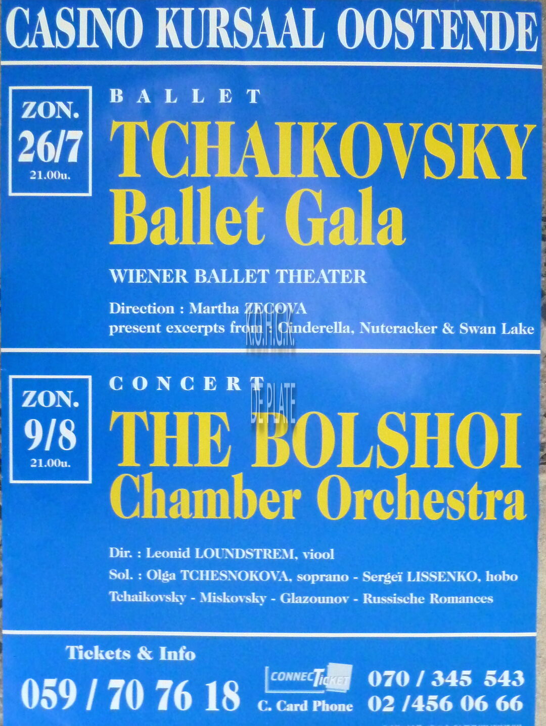 Formaat : 81 x 60 cm. - Wiener Ballet Theater. Direction : Martha Zecova. Present excerps from : Cinderella, Nutcracker & Swan Lake. - The Bolshoi Chamber Orchestra. Dir. : Leonid Loundstrem, viool. Sol. : Olga Tchesnokova, soprano, Sergeë Lissenko, hobo. Tchaikovsky, Miskovsky, Glazounov, Russische Romances