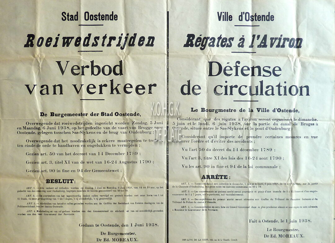Formaat : 53 x 73 cm. - Tweetalig. - Verkeersregeling naar aanleiding van de roeiwedstrijden op het kanaal Brugge - Oostende, tussen Sas-Slijkens en de brug van Oudenburg op 5 en 6 juni 1938. Getekend : de burgemeester, Dr. Ed. Moreaux
