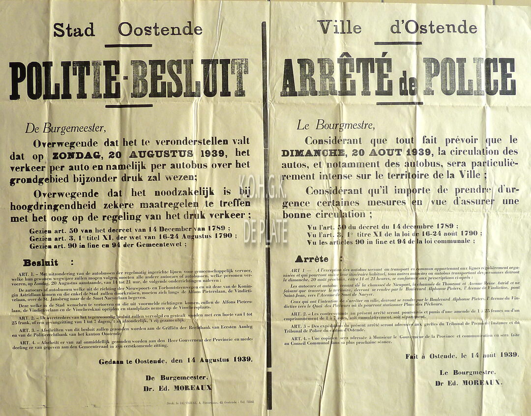 Formaat : 55 x 73 cm. - Tweetalig. - Verkeersreglement voor auto's en autocars naar aanleiding van een drukke zondag 20 augustus 1939. Getekend : de burgemeester, Dr. Ed. Moreaux