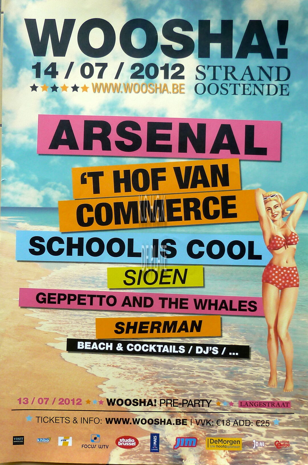 Formaat : 60 x 40 cm. - Arsenal, 't Hof Van Commerce, School is Cool, Sioen, Geppetto and the Whales, Sherma. Beach & Coctails / DJ'S / ... 13/07/2012 : Woosha 8 pre-party - Langestraat