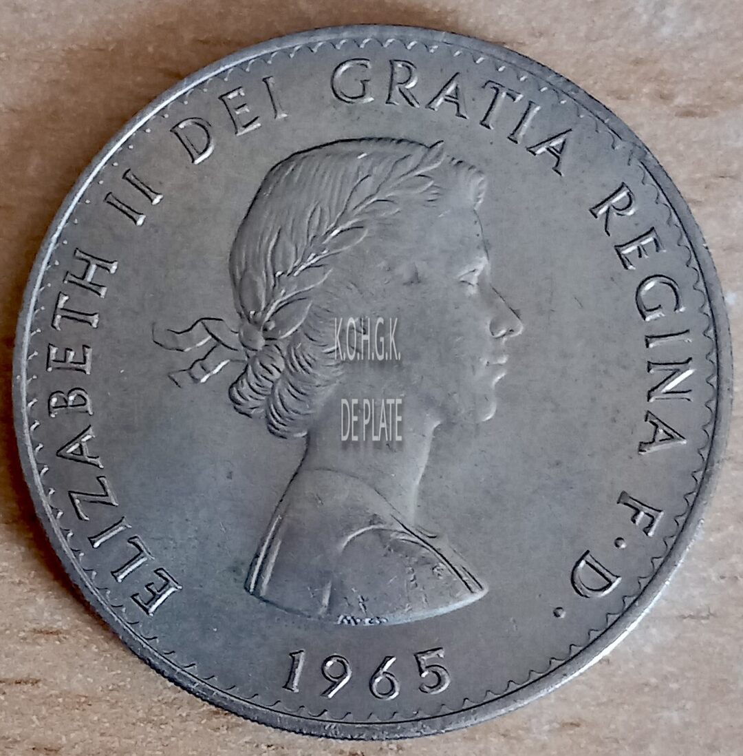 Op de keerzijde : tegen de buitenrand rondom een sierrand, rondom boven ELIZABETH II DEI GRATIA REGINA F.D., rondom onder 1965, centraal het hoofd van koningin Elizabeth II naar rechts gericht