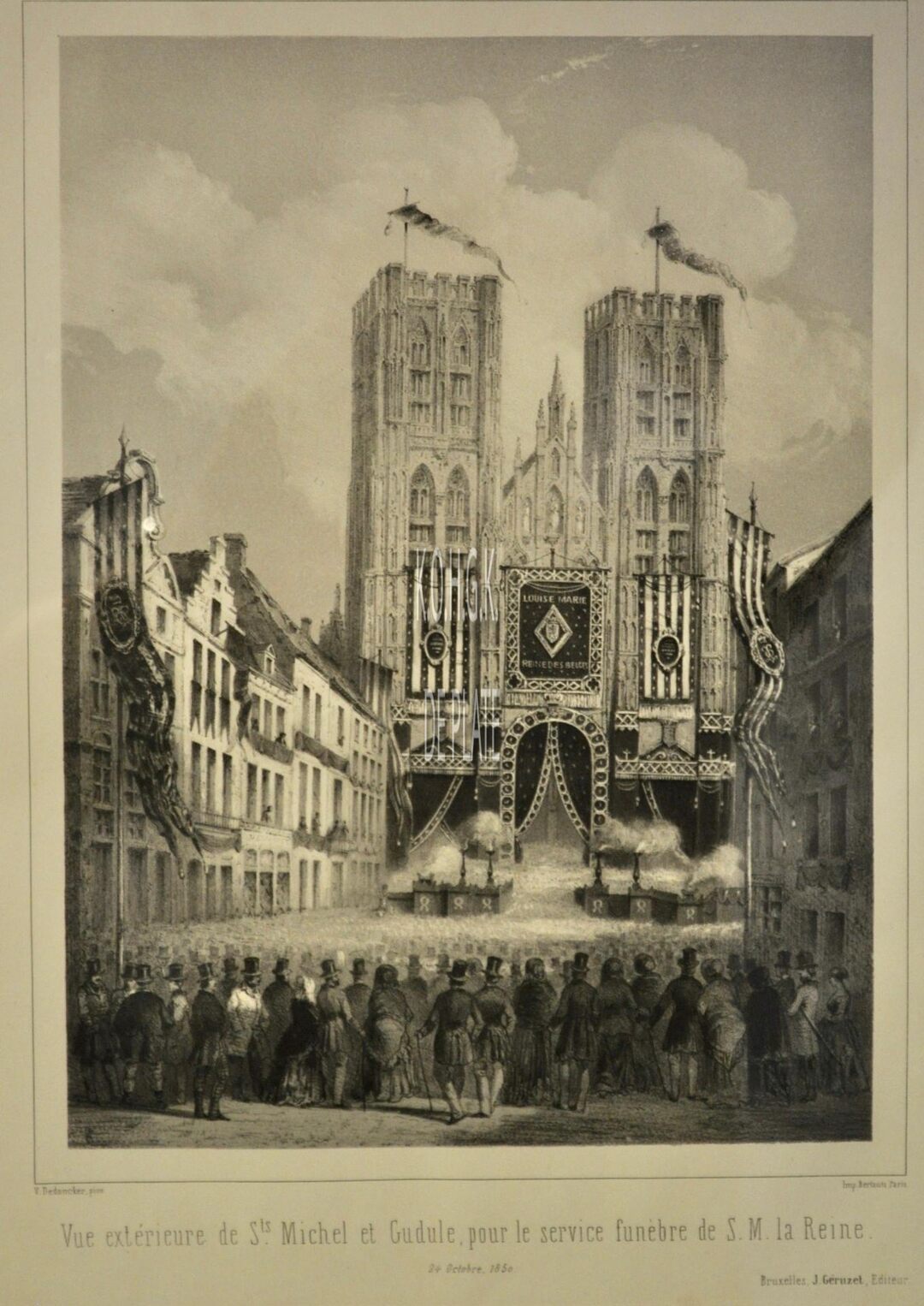 Rechtsboven : nr. 8 Linksonder : V. De Donker Pinx Rechtsonder : Imp. Berlauts, Paris Midden : Vue extérieure de l’église de Sint Michel et Gudulepour le service funèbre de Sa Majesté la Reine 24 oktober 1850