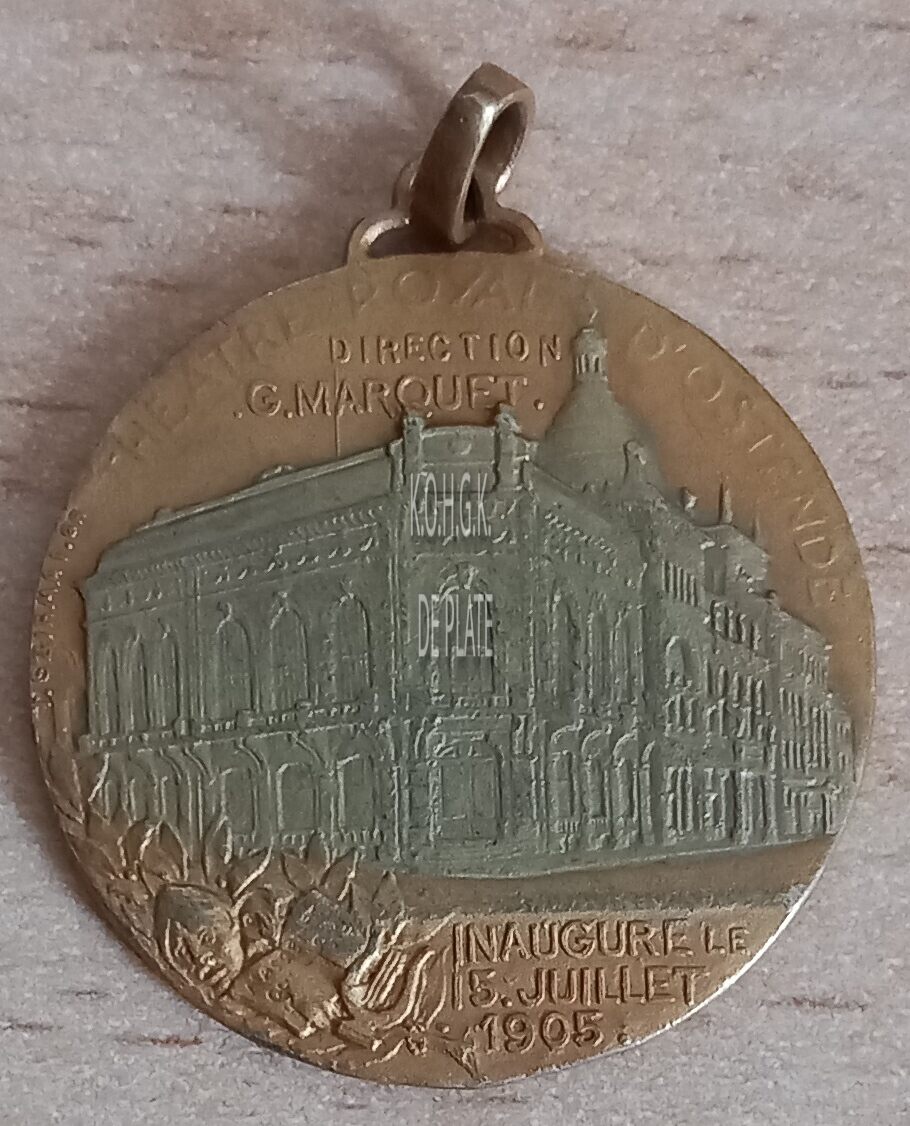 Op de voorzijde : rondom boven THEATRE ROYALE D’OSTENDE, horizontaal boven DIRECTION / .G. MARQUET., centraal een afbeelding van de koninklijke schouwburg, onder links afbeelding van masker, partituren en lier, onder rechts horizontaal INAUGURE LE 15. JUILLET / 1905