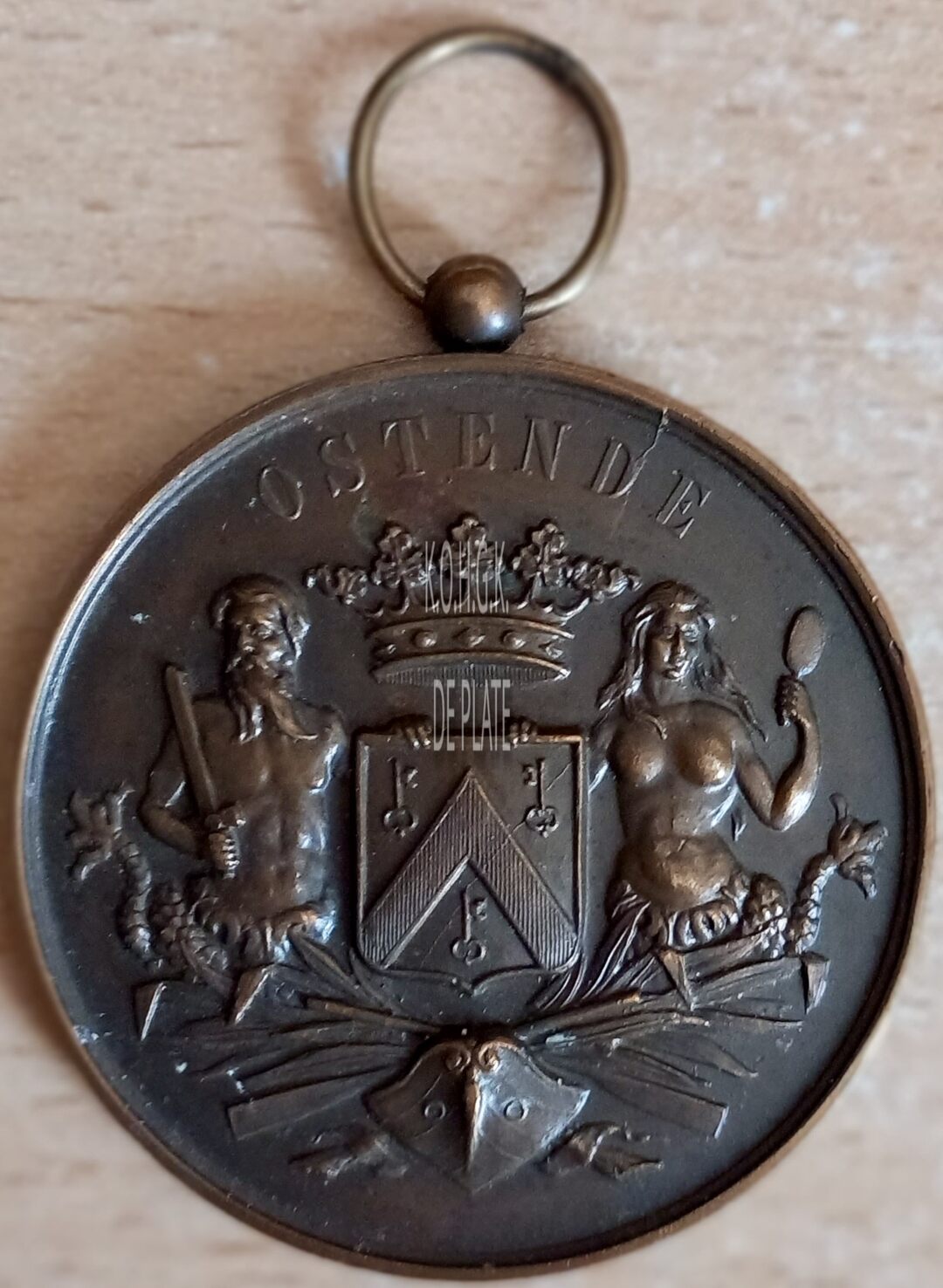 Op de voorzijde : rondom boven OSTENDE, centraal het gekroonde wapenschild met keper en drie sleutels van de stad Oostende, geflankeerd door twee schildhouders, links meerman met zwaard naar links kijkend, rechts meermin met handspiegel naar rechts kijkend, geplaatst boven een boeg op zee en gevuld met palmbladeren en twee gekruiste roeispanen
