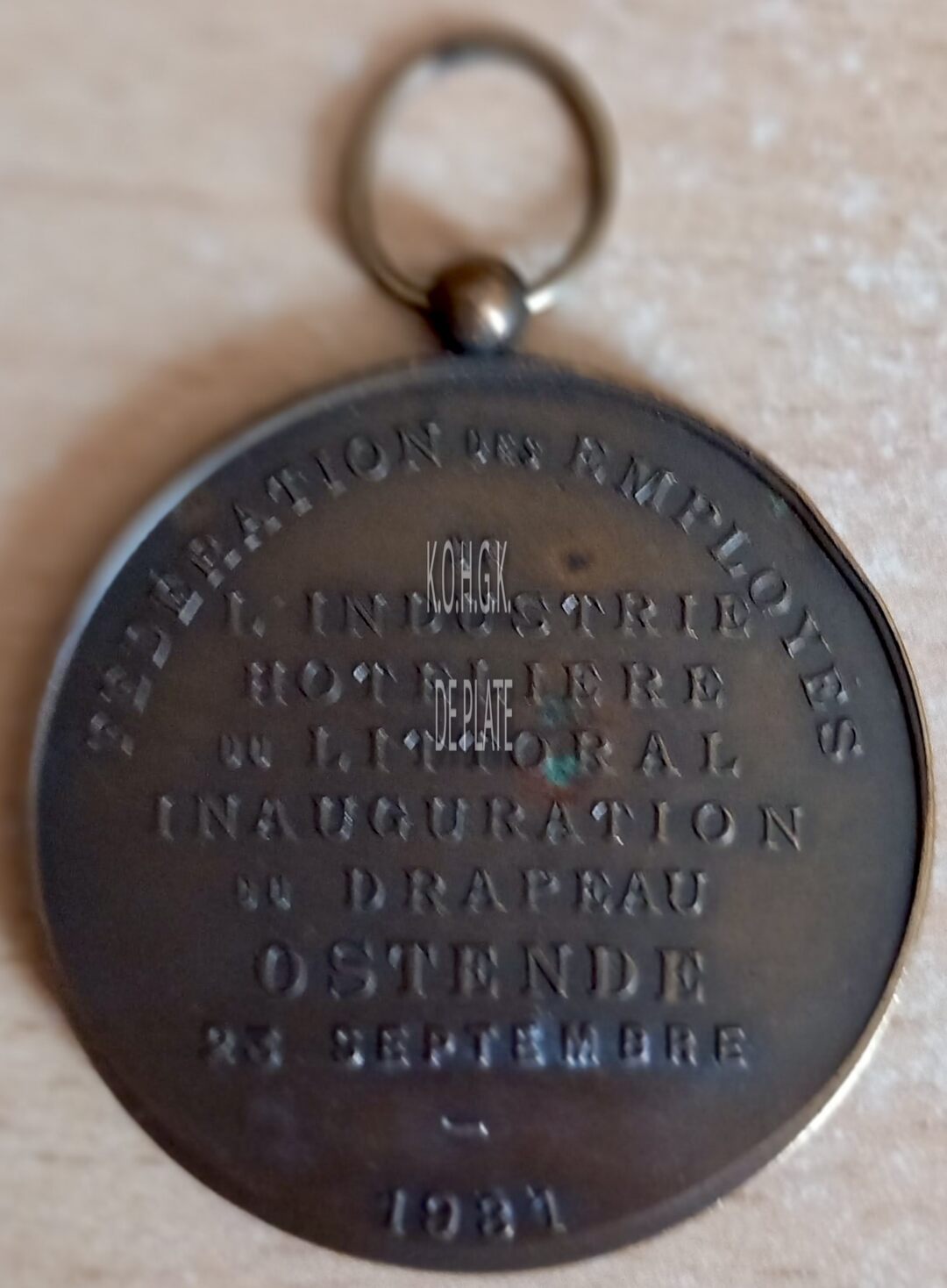 Op de keerzijde : rondom boven FEDERATION DES EMPLOYES, horizontaal DE / L’INDUSTRIE / HOTELIERE / DU LITTORAL / INAUGURATION / DU DRAPEAU / OSTENDE / 23 SEPTEMBRE, rondom onder 1931