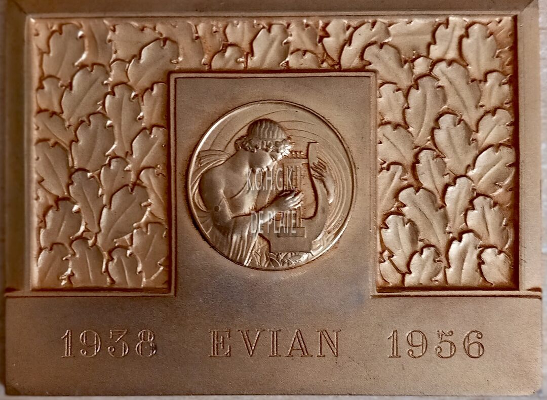 Op de voorzijde : centraal in een medaillon een afbeelding van de muze Terpsichore met lier, rond het medaillon in een omgekeerde U-vorm laurierlierbladeren, horizontaal onder 1938 EVIAN 1956
