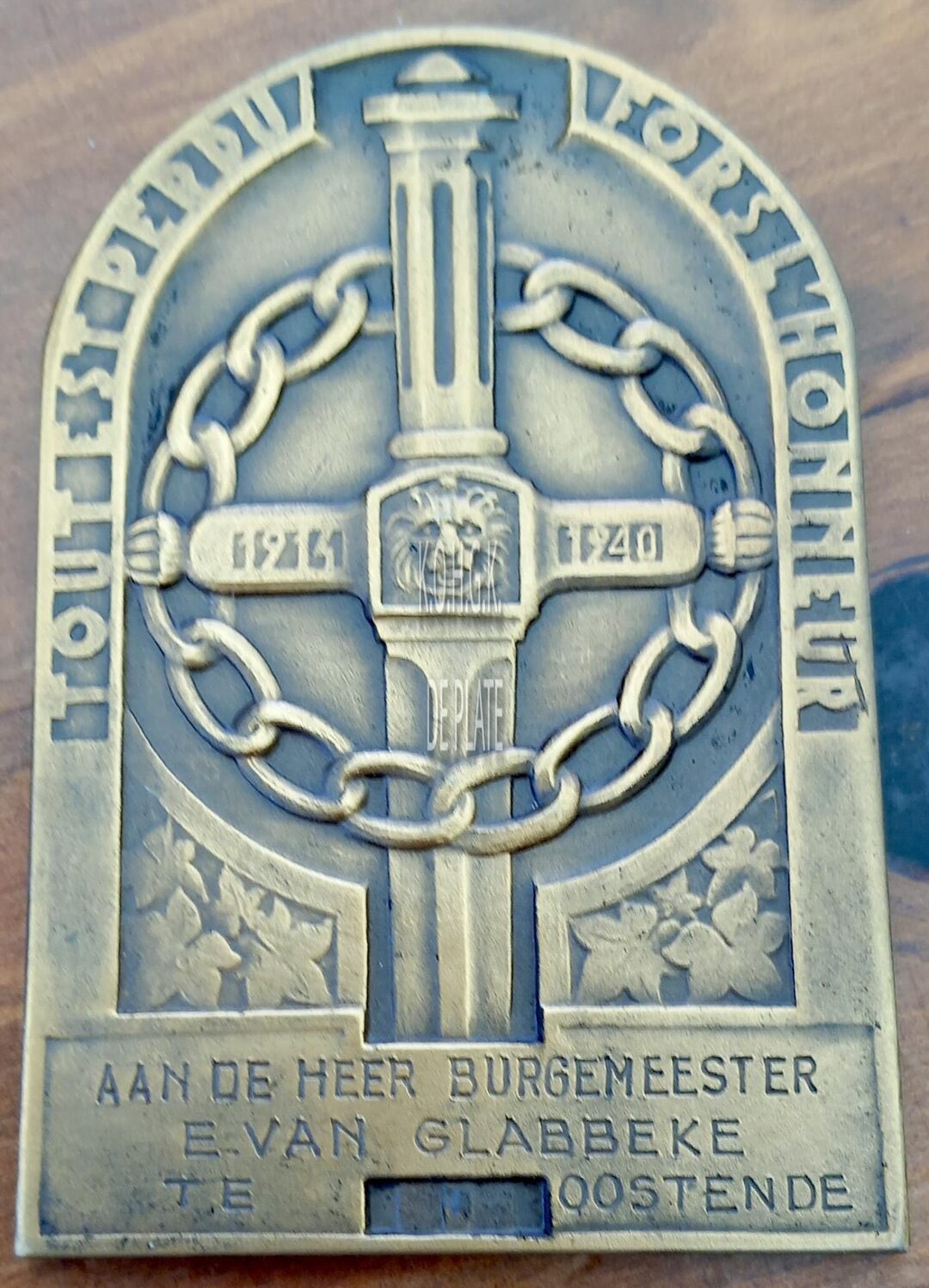 Op de keerzijde : links naast dee rand TOUT EST PERDU, rechts naast de rand FORS L’HONNEUR, centraal de bovenste helft van een geketend zwaard, op de pareerstang van het gevest links 1914, midden een leeuwenkop, rechts 1940, op de afsnede AAN DE HEER BURGEMEESTER / E. VAN GLABBEKE / TE OOSTENDE