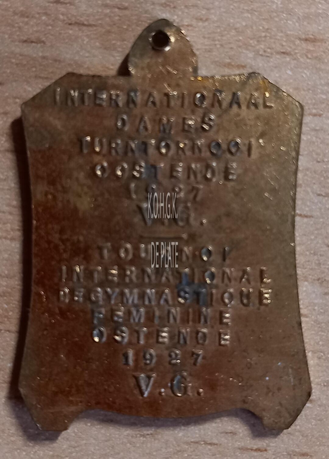 Op de keerzijde : horizontaal INTERNATIONAAL / DAMES / TURNTORNOOI/ OOSTENDE /1927 / V.G. / – / TOURNOI / INTERNATIONAL / DE GYMNASTIQUE / FEMININE / OSTENDE / 1927 / V.G.