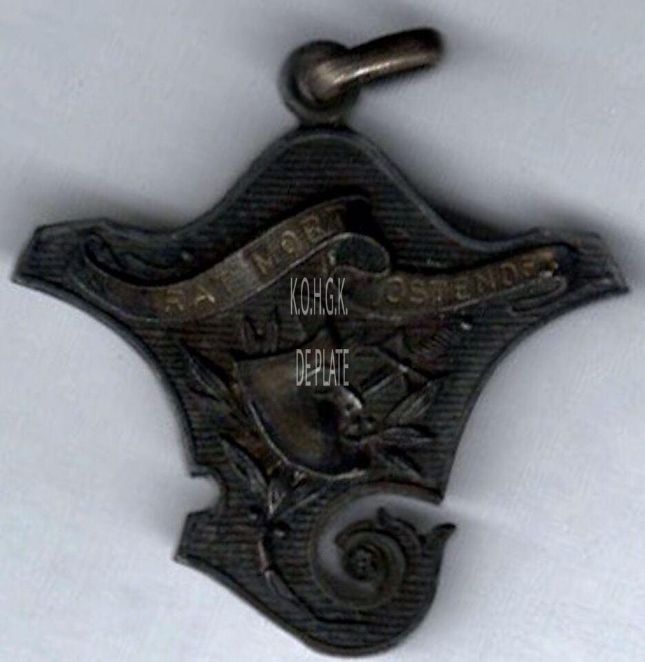 Op de voorzijde : bovenaan een lint met RAT MORT OSTENDE, centraal links een lauriertak met er boven een masker en links een sabel (dit alles in bas-reliefs)