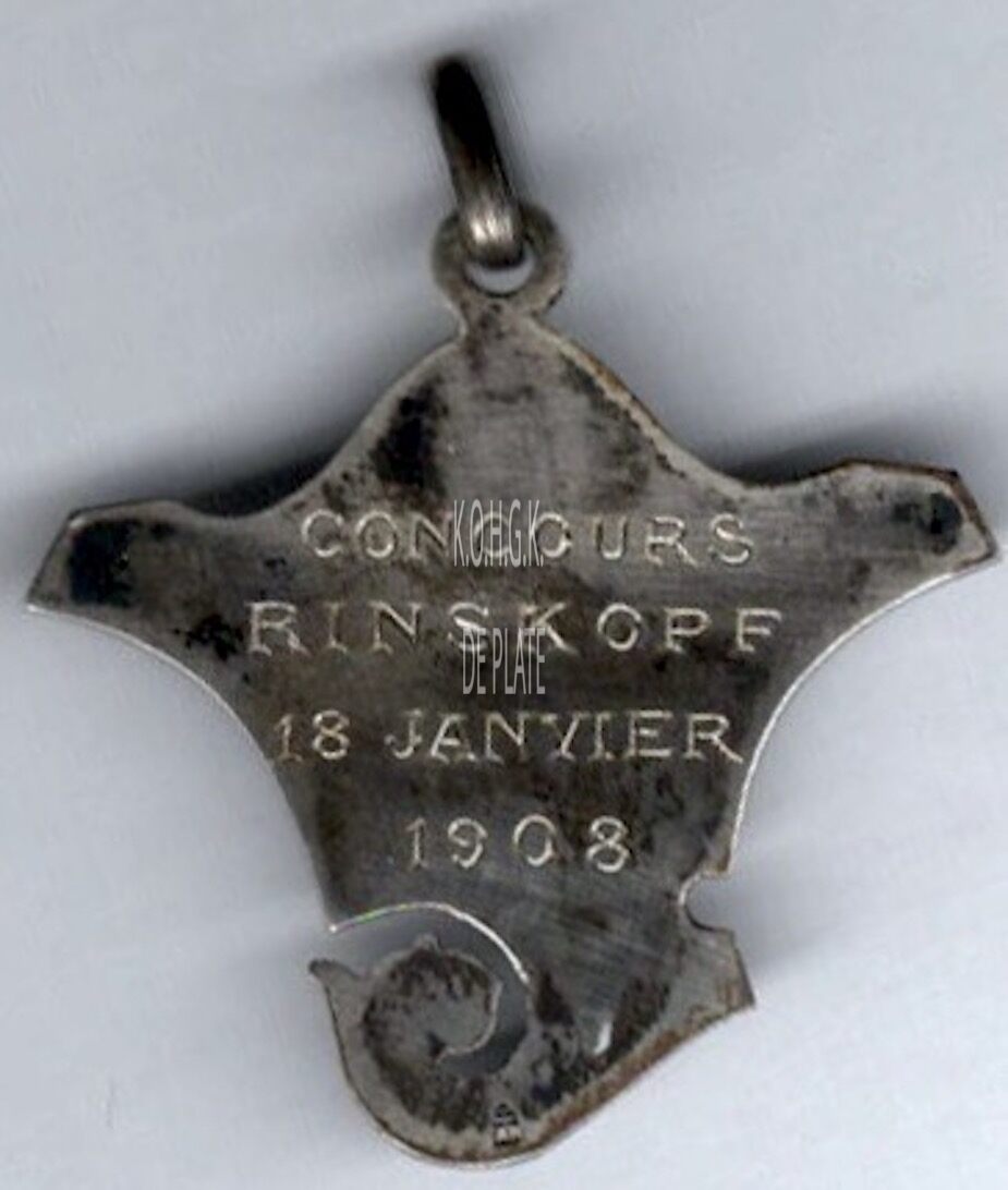 Op de keerzijde : heeft een vlak oppervlak, horizontaal ingegraveerd CONSOURS / RINSKOPF / 18 JANVIER / 1908