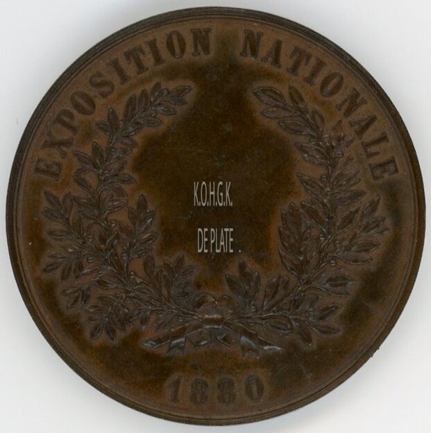 Op de keerzijde : rondom boven EXPOSITION NATIONALE, centraal twee lauriertakken onderaan samengestrikt met een lint, midden onder 1880