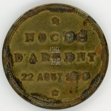 Op de keerzijde : horizontaal ✭ / NOCES / D’ARGENT / 22 AOUT 1878 / ✭ De gedenkpenning werd geslagen naar aanleiding van de zilveren bruiloft van Leopold II en Maria Hendrika.