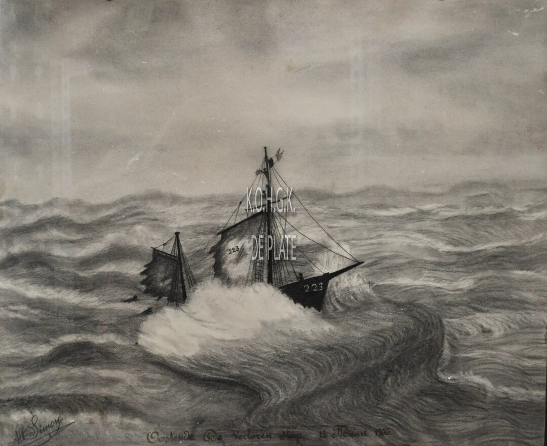 Gesigneerd linksonder : Alf. Simon Middenonder : Oostende De verloren sloep 12 maart 1906