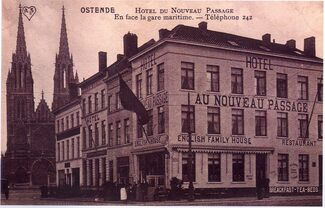 Gevelteksten : Hotel Au Nouveau Passage. English Family House. Breackfast-Tea-Beds. Op de achtergrond de Sint Petrus- en Pauluskerk