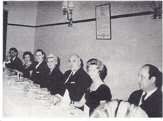 Foto's : (1) Het banket : van links naar rechts : dhr. Follebouckt, mevr. Quaghebeur, burgemeester Jan Piers, mej. Rita Coucke (uitgeefster Ostend Flash), volksvertegenwoordiger Maurice Quaghebeur, mevr. Piers en dhr. John Hermans (journalist) en (2) de receptie