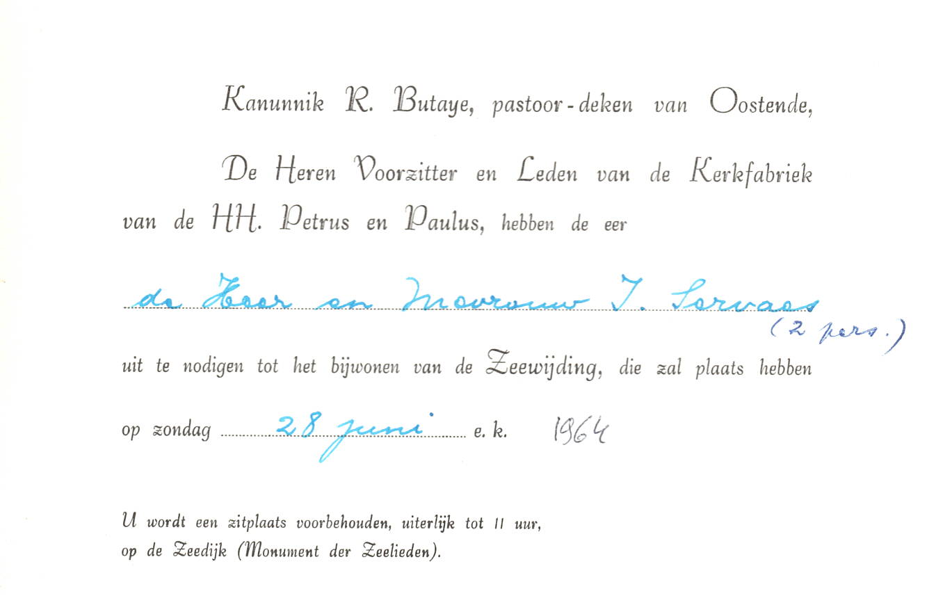 Van kanunnik R. Butaye aan de heer en mevrouw J. Servaes tot het bijwonen van de Zeewijding op 28 juni 1964
