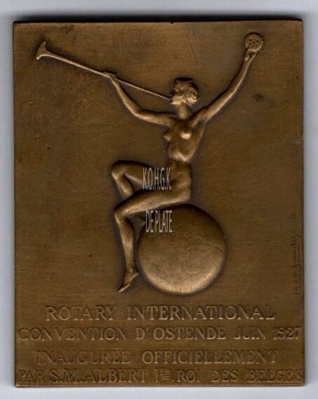 Op de voorzijde : Een naakte vrouw zittend op een wereldbol, in de rechterhand een bazuin en in de linkerhand een rad?, eronder horizontaal ROTARY INTERNATIONAL / CONVENTION D’OSTENDE JUIN 1927 / INAUGUREE OFFICIELLEMENT / PAR S.M. ALBERT Ier DES BELGES, gesigneerd langs de rechterzijkant EUG. J. DE RAEDEMAECKER