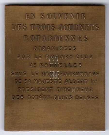 Op de keerzijde : EN SOUVENIR / DES TROIS JOURNEES / ROTARIENNES / ORGANISEES / PAR LE ROTARY CLUB / DE BRUXELLES . SOUS LA HAUT PATRONNAGE / DE SA MAJESTE ALBERT Ier / PRESIDENT D’HONNEUR DES ROTARY CLUBS BELGES