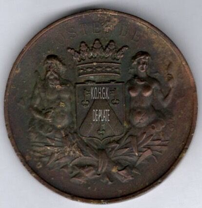 Op de voorzijde : centraal het gekroonde wapenschild met keper en drie sleutels van de stad Oostende, geflankeerd door twee stadshouders, links meerman met zwaard naar links kijkend, rechts meermin met handspiegel naar rechts kijkend, alles geplaatst op palmbladeren samengebonden met lint, rondom boven OSTENDE