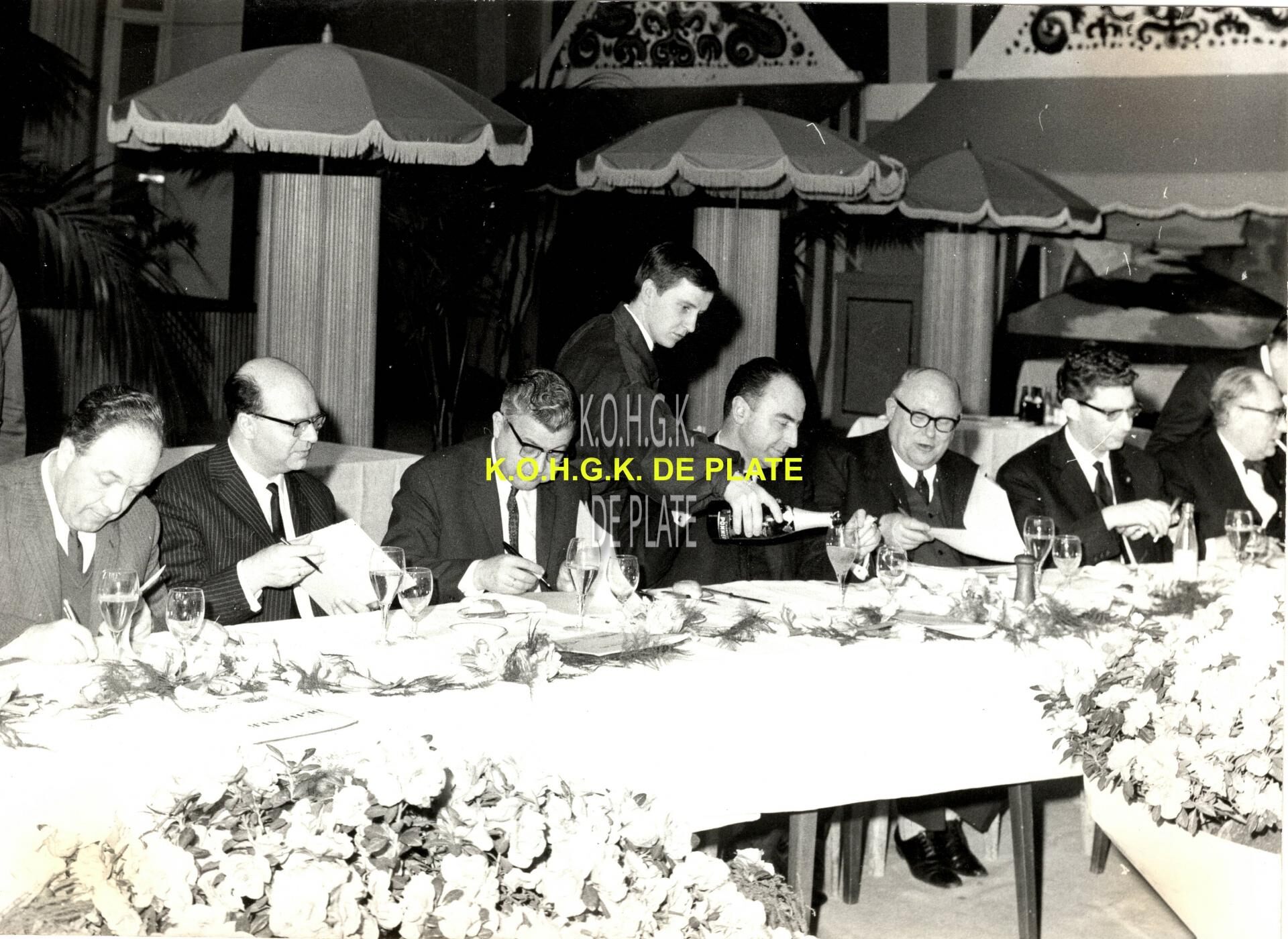 Formaat : 13 x 18 cm. - Aan tafel herkennen we, tweede van links, Rik Onckelinckx, vierde van links, premier Vanden Boeynants en zesde van links, vicepremier Willy Declercq. Paul Vanden Boeynants was premier en minister van wetenschapsbeleid. Willy Declercq was vicepremier en minister van begroting. De regering Vanden Boeynants I bestond uit een coalitie van christelijke PSC/CVP en liberale PVV/PLP partijen.
