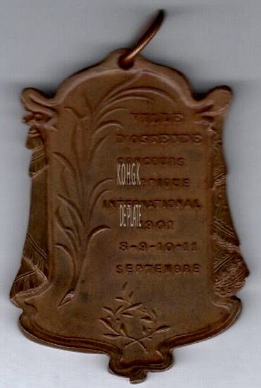 Op de keerzijde : links een palmtak, horizontaal VILLE / D’OSTENDE / CONCOURS / HIPPIQUE / INTERNATIONAL / 1901 / 8-9-10-11 / SEPTEMBER