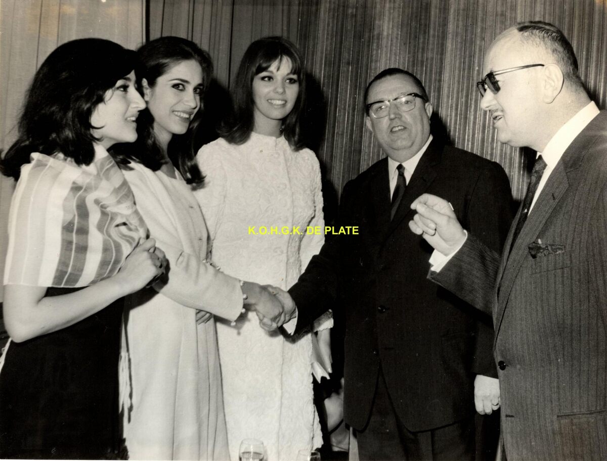 Formaat : 18 x 24 cm. - Drie schoonheidskoninginnen in het gezelschap van Roger De Ramée (rechts), directeur van de Kursaal en John Lauwereins, waarnemend burgemeester
