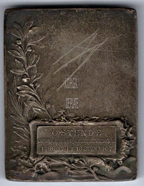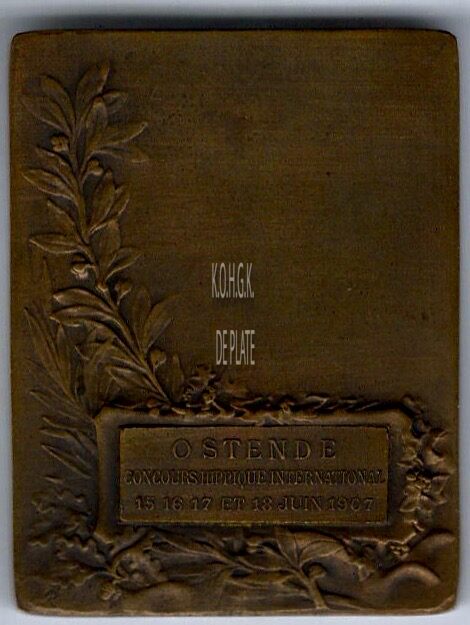 Op de keerzijde : van onder naar linksboven een lauriertak, midden onder op een plaket horizontaal OSTENDE / CONCOURS HIPPIQUE INTERNATIONAL / 15 16 17 ET 18 JUIN 1907