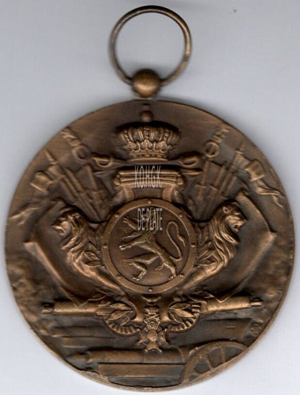Op de voorzijde : centraal in een rond schild een gevorkte en klauwende leeuw, erboven rustend op twee gekruiste sabels een kroon, aan beiden zijden van het schild een leeuw naar links en rechts kijkend, tussen schild en leeuw een lauriertak, naast de kroon aan beide zijden baniers, onderaan het schild hangt de Leopoldsorde, dit alles geplaatst op een kanon.