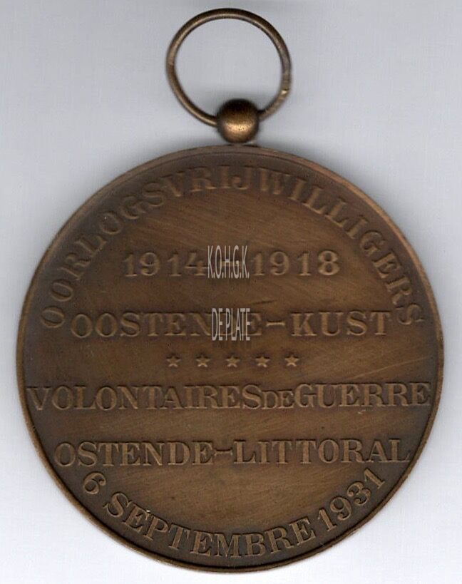 Op de keerzijde : rondom boven OORLOGSVRIJWILLIGERS, centraal horizontaal 1914-1918 / OOSTENDE-KUST / ✭✭✭✭✭ / VOLONTAIRES DE GUERRE / OSTENDE-LITTORAL, rondom onder 6 septembre 1931