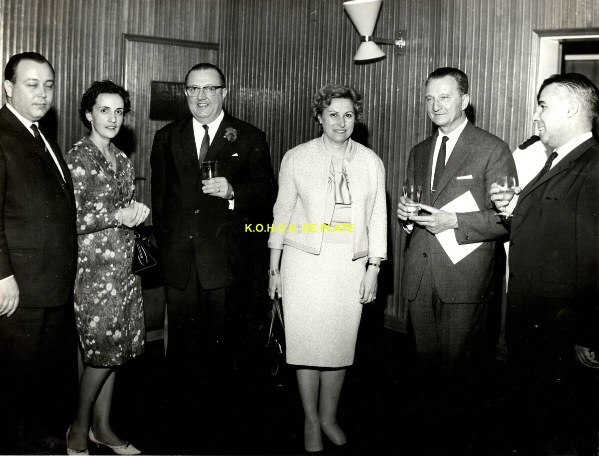 Formaat : 18 x 24 cm. - Receptie naar aanleiding van het concert door het Symfonieorkest van de BRT-RTB op de Nationale Feestdag. Waarnemend burgmeester John Lauwereins en echtgenote (derde en vierde van links). Rechts, schepen Raymond Miroir.