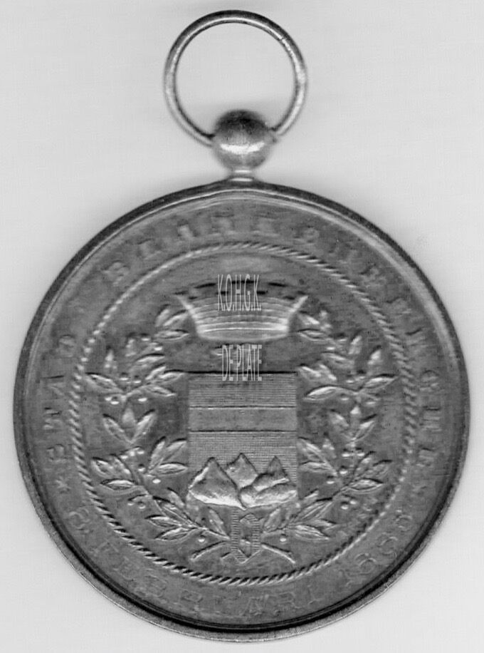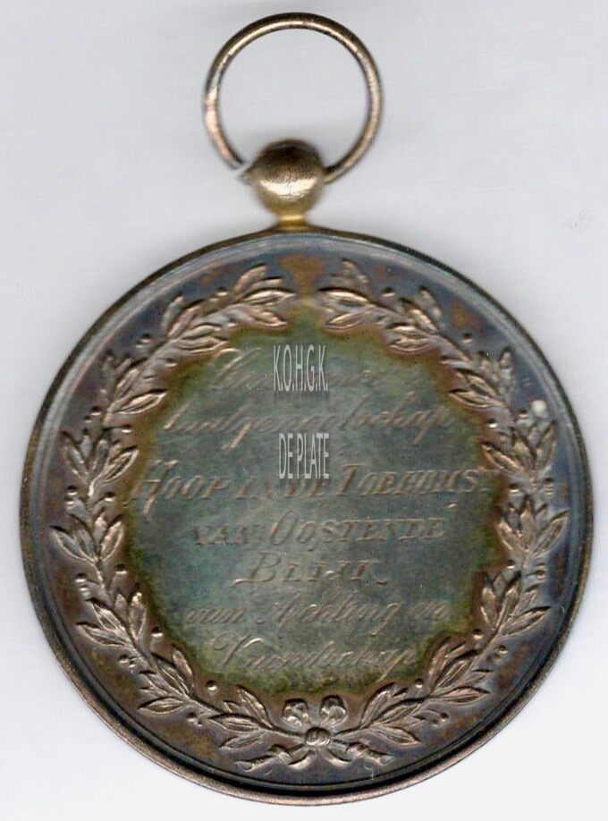 Op de keerzijde : rondom aan beide zijden een lauriertak onderaan samen gestrikt, centraal horizontaal CONSCIENCE’S / TAALGENOOTSCHAP / AAN / HOOP IN DE TOEKOMST / VAN OOSTENDE / BLIJK / VAN ACHTING EN /VRIENDSCHAP